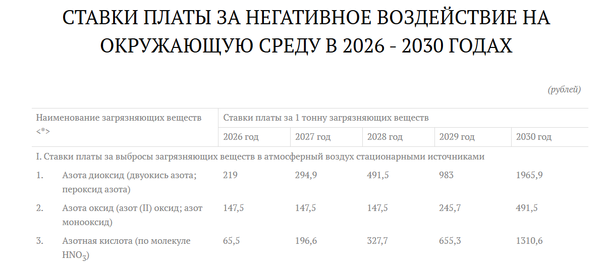 №4. Новые ставки платы за негативное воздействие на окружающую среду (НВОС). С 1 января 2026 действуют обновленные ставки платежей за выбросы, сбросы и отходы, утвержденные распоряжением Правительства РФ от 01.09.2025 № 2409-р. Утверждены ставки на 2026-2030 годы с поэтапным ежегодным повышением. Методика расчета осталась прежней (учет класса опасности веществ и удельного экологического ущерба), однако базовый показатель ущерба проиндексирован до цен 2024 года (впервые за многие годы).
