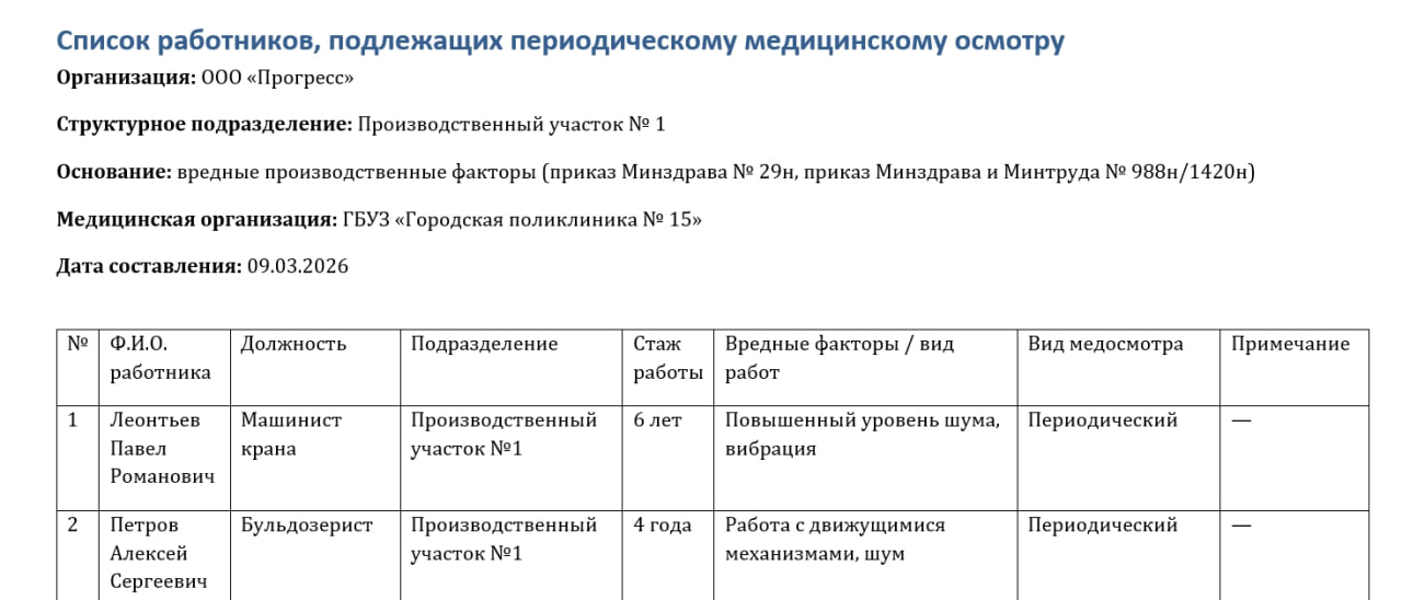 Список работников, подлежащих периодическому медицинскому осмотру: образец