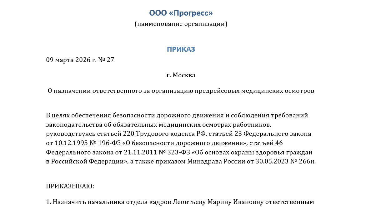 Приказ о назначении ответственного за предрейсовый медосмотр
