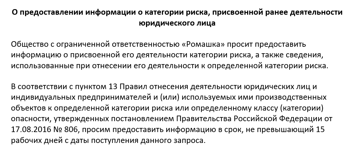 Письменный запрос в ГИТ о предоставлении информации о категории риска: образец