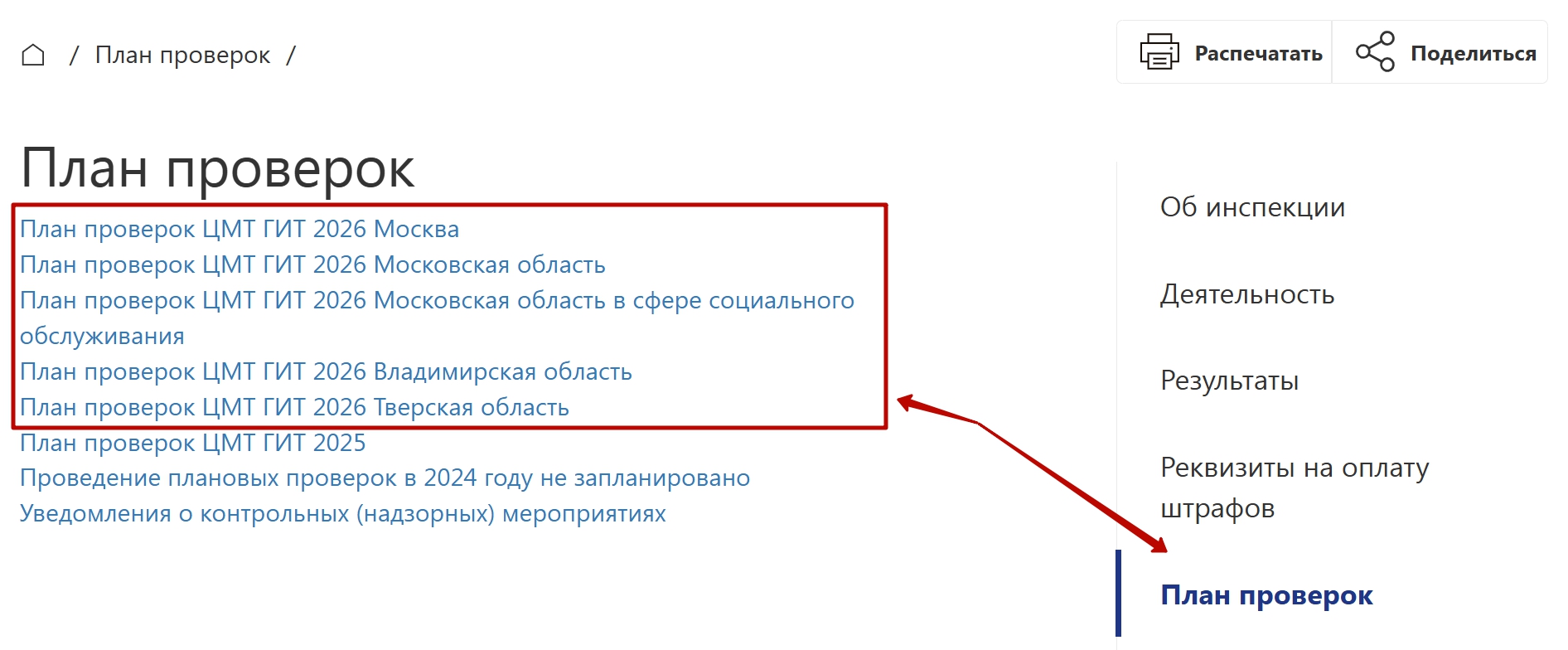 3. Проверить, есть ли ваша компания в плане проверок на официальном сайте вашего ГИТ. Например, на сайте ЦМТ ГИТ планы проверок уже опубликованы.