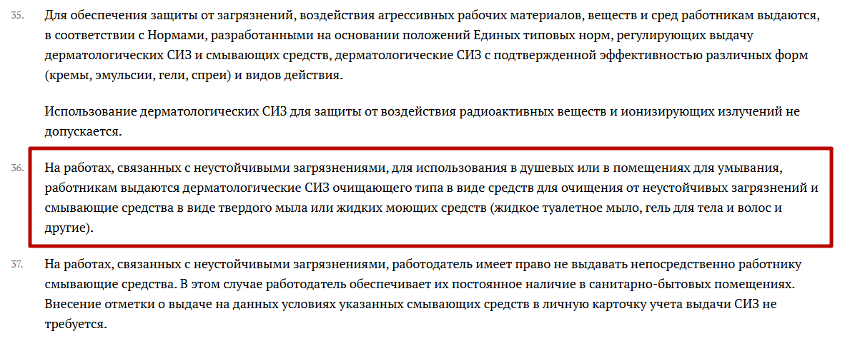 На вопрос «Обязан ли работодатель обеспечить выдачу смывающих средств офисным сотрудникам по ЕТН?», эксперты ответили однозначно — да. На работах, связанных с неустойчивыми загрязнениями, а также в помещениях для умывания, работникам выдаются дерматологические СИЗ очищающего типа в виде средств для очищения от неустойчивых загрязнений и смывающие средства в виде твердого мыла или жидких моющих средств. Выдача дерматологических СИЗ и смывающих средств может также осуществляться при помощи дозирующих систем. Это прямо указано в п.36 Правил обеспечения работников СИЗ, утв. приказом Минтруда РФ от 29.10.2021 №766н.