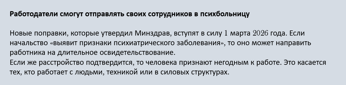 После того как чиновники приказом Минздрава от 02.07.2025 № 392н утвердили новый Порядок психосвидетельствования работников, началась настоящая паника. Некоторые СМИ и ТГ-канали начали публиковать информацию о том, что с 1 марта 2026 года любой работодатель, если у него возникает подозрение в психических отклонениях работника, может по своей инициативе принудительно направить его на психиатрическое освидетельствование. Пример таких сообщений ниже.